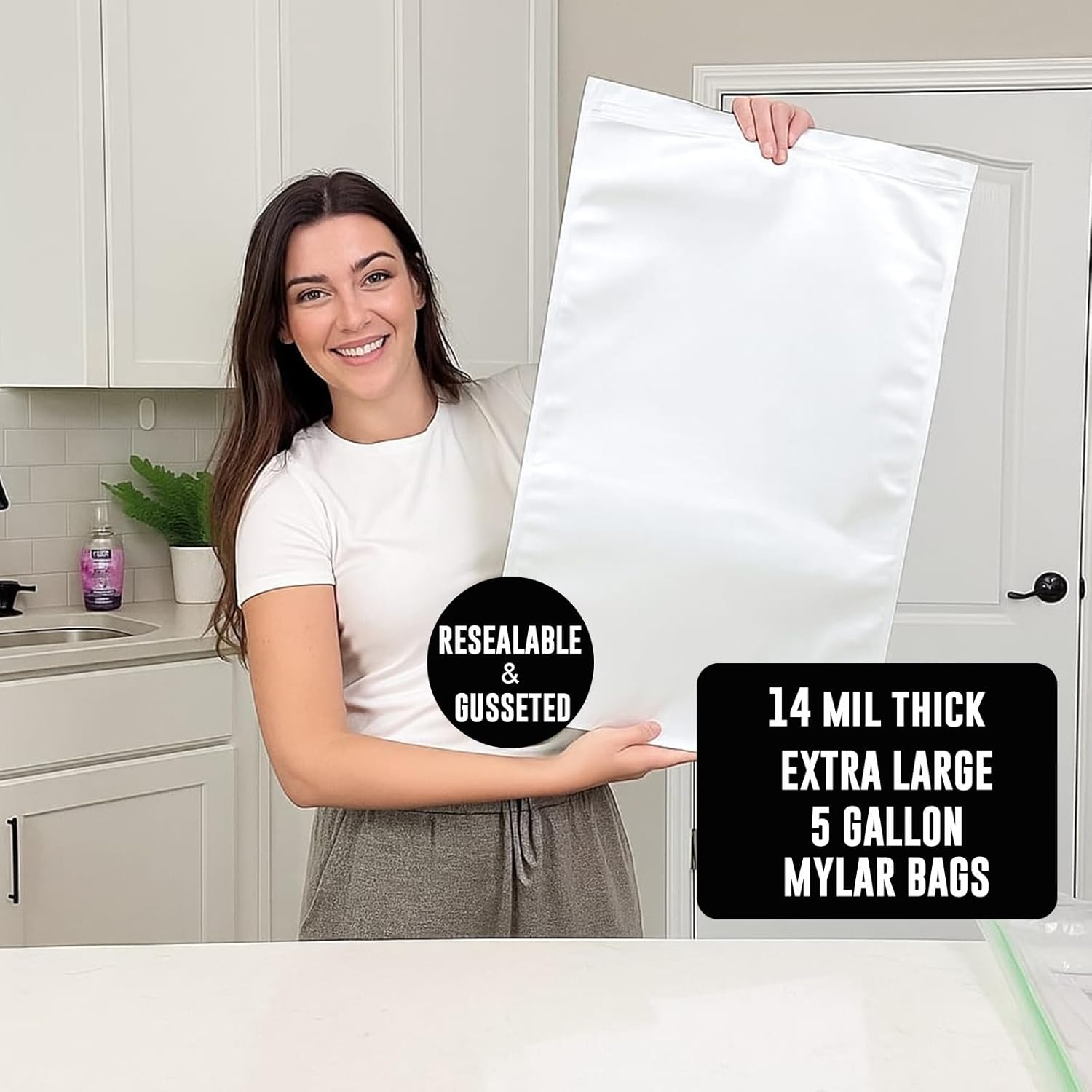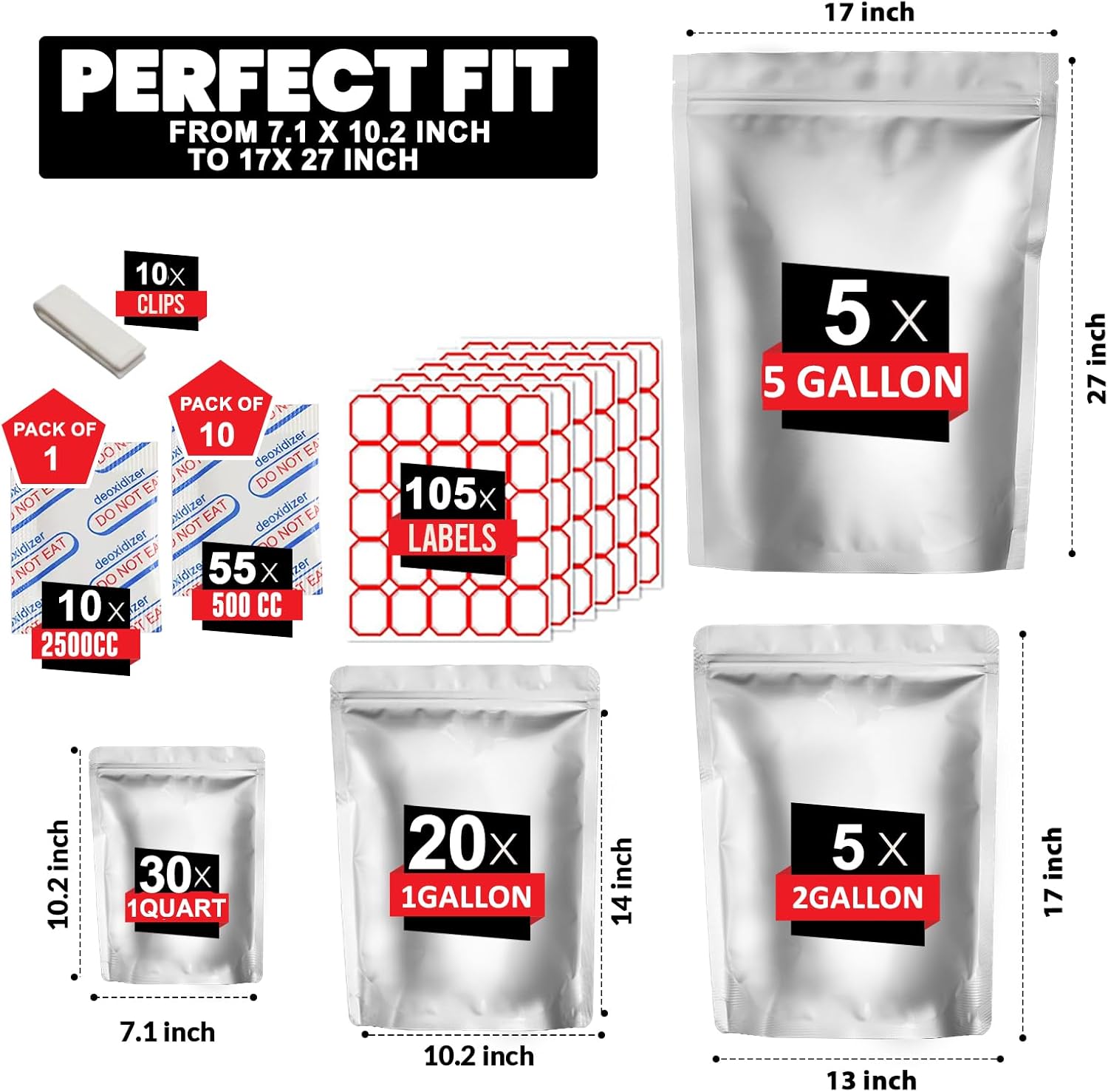 These multi-size Mylar bags are designed for both versatility and durability. Whether you need to store small snacks or bulk grains, the kit includes 5 Gallon, 2 Gallon, 1 Gallon, and 1 Quart bags—all resealable and heat-sealable for ultimate freshness. The included 55 × 500cc oxygen absorbers and 10 × 2500cc absorbers provide airtight protection, keeping air, moisture, and light out. With reseal zippers for quick daily use and labels for easy tracking, you’ll stay organized and confident in your food storage.